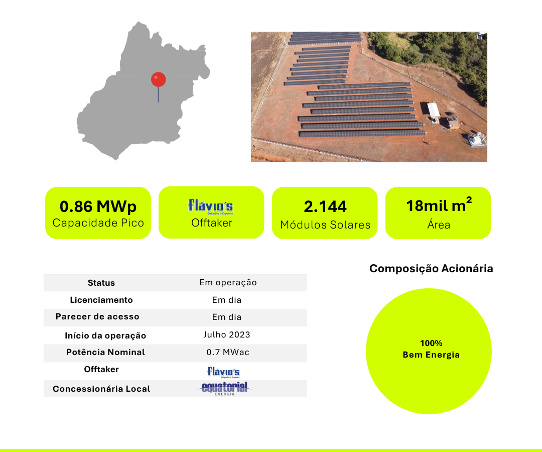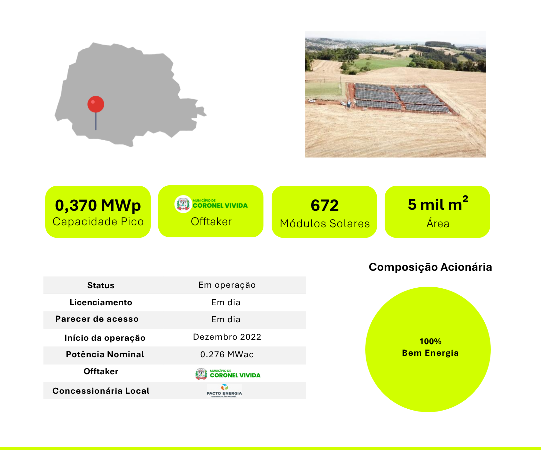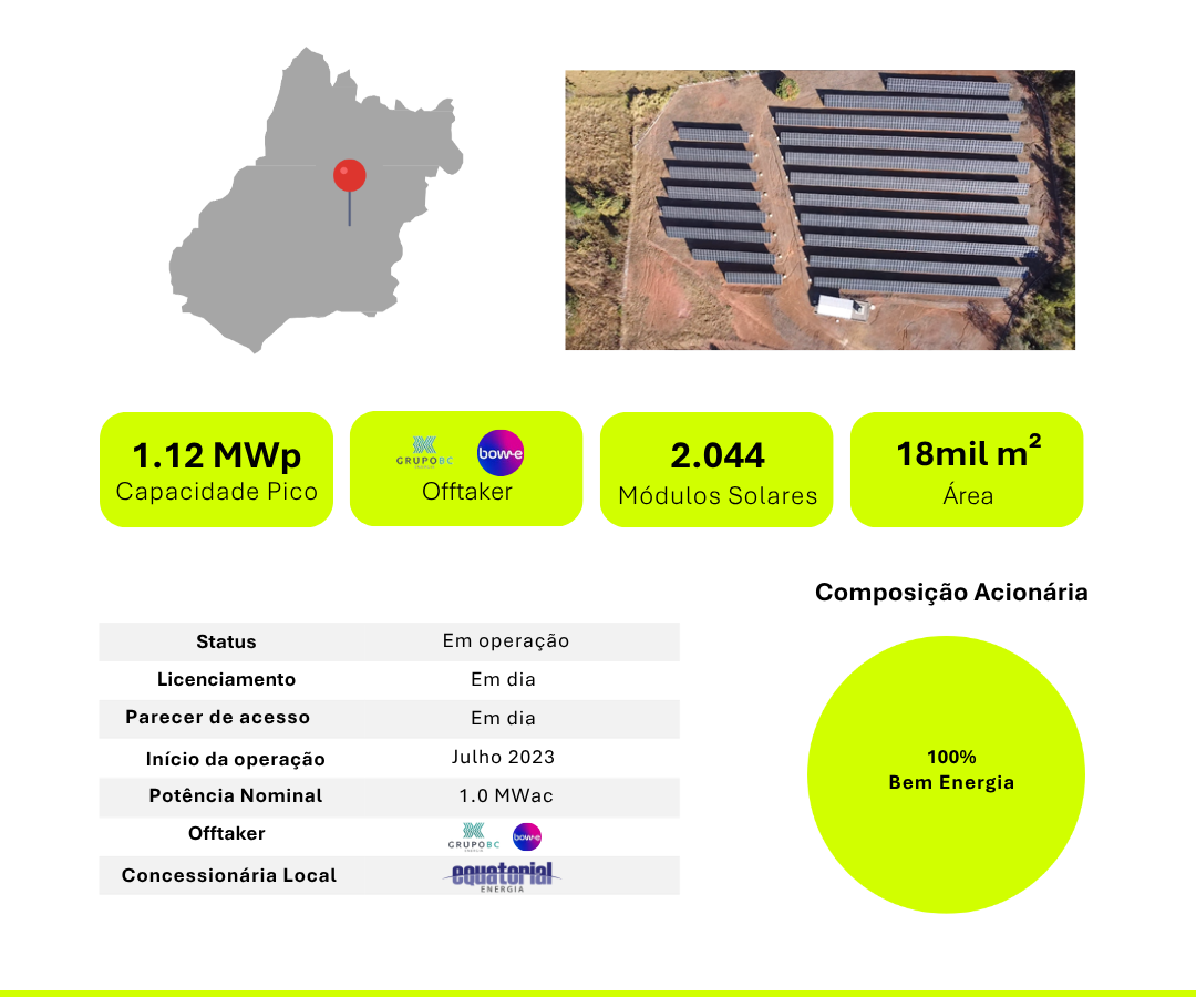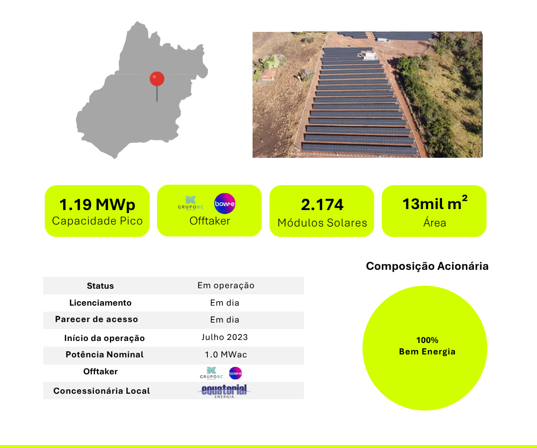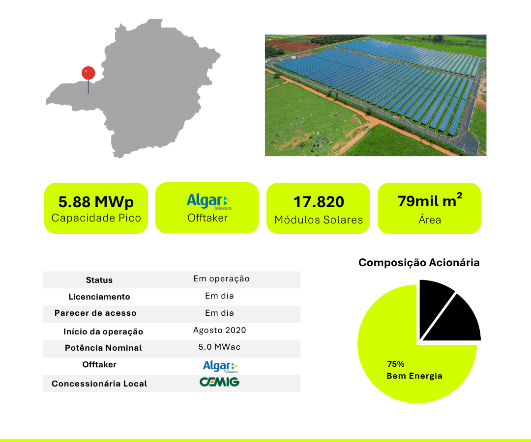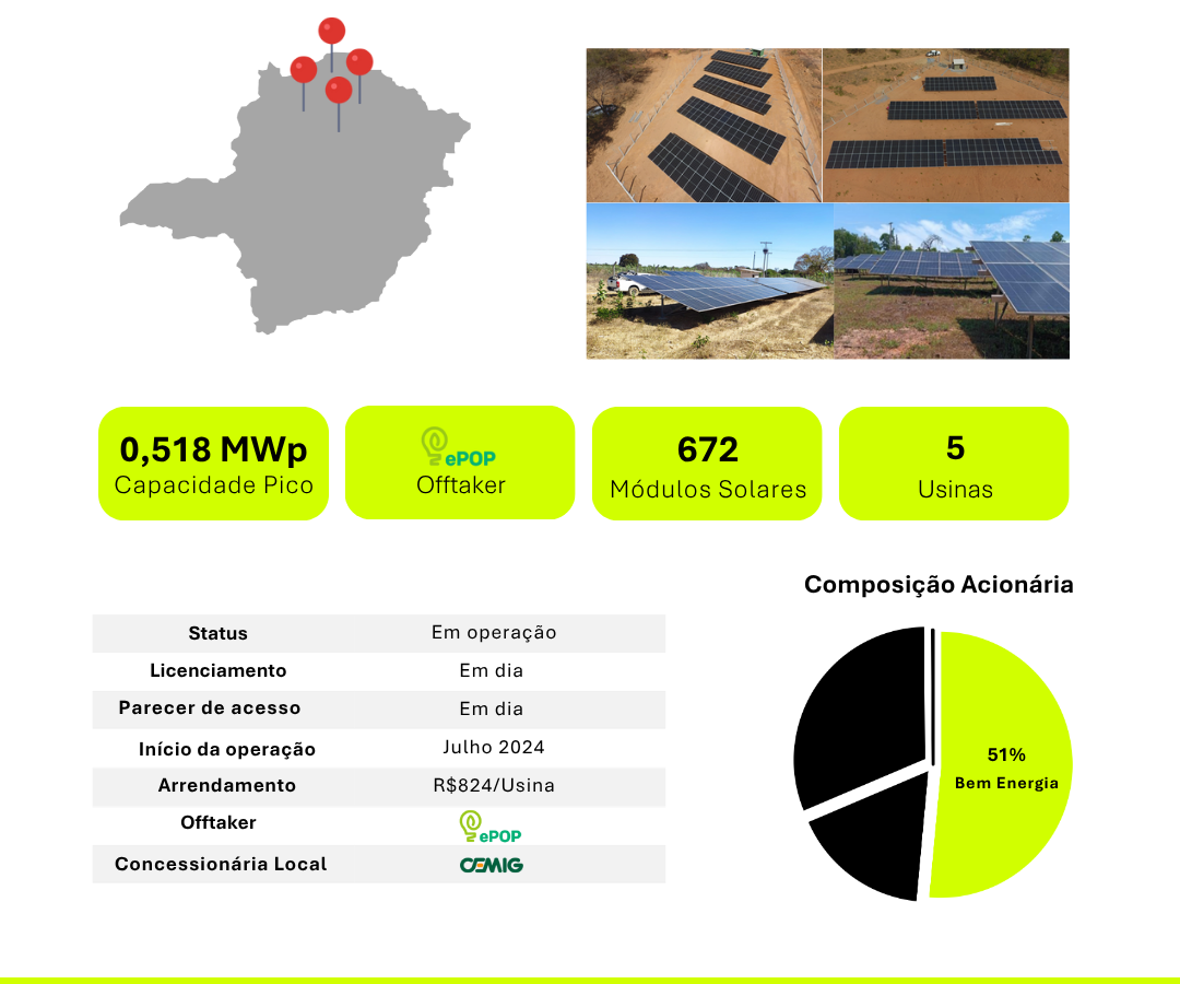 Ativos de Geração UFV Capim Branco Bem GO I Bem GO II Bem GO III Bem PR I Bem MG I Localização: Uberlândia-MG Localização: Alexânia-GO Localização: Alexânia-GO Localização: Alexânia-GO Localização: Coronel Vivida - PR Localização: Lagoa dos Patos; Brasília de Minas; Verdelândia; Matias Cardoso - MG
